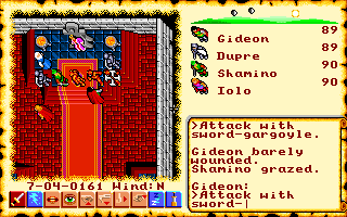 After this slight fumble in the opening, though, the game immediately starts being fun. Lord British relates how the underworld has collapsed and the gargoyles (he uses the term right away) have started to invade Britannia through the dungeons. They've captured all the shrines to the eight virtues.