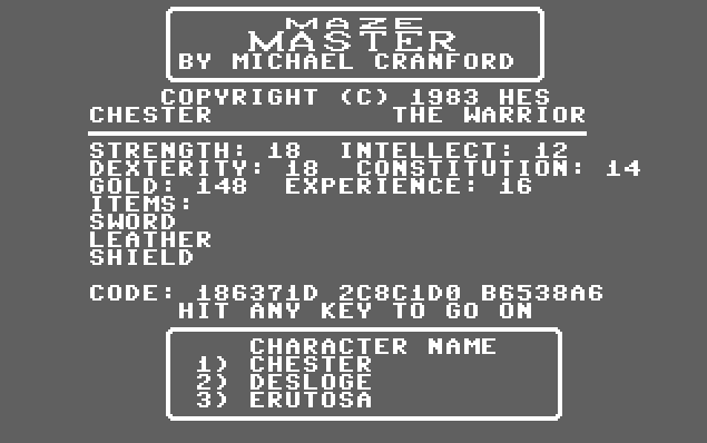 I put “reload” in quotes because there’s no “save” mechanism in the game. Instead, upon returning to the surface, you can “examine” the character to get a 21-character code, copy it down, and enter the code the next time you start the game to “restore” the character in the same condition. The characters don’t seem to conform to any obvious pattern for the attributes and such—they’re not hex code—so I’m not sure if there’s a way to cheat the game by creating mighty characters from the start. The code system is based on the character, not the game, so it creates a weird dynamic where if a character dies, you could restore an earlier incarnation of him but maintain the improved experience levels and gold of the characters who survived. Or you could create a new party that includes the best versions of characters from multiple previous parties.