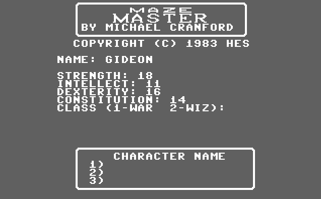 Character creation is a simple process of giving a name to your character, after which the game rolls random figures between 3 and 18 for strength, intelligence, dexterity, and constitution. Constitution serves as the hit point maximum. Once you see the scores, you decide whether to assign the character to the warrior or wizard classes. If you don’t like the attribute rolls, your only option is to finish the creation process, then delete the character and try again.