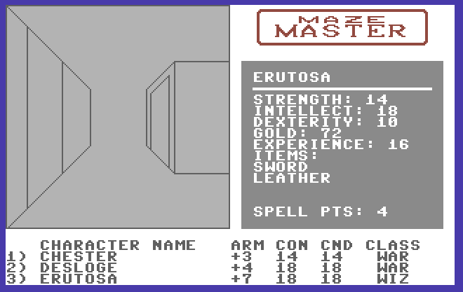 In Maze Master, we have a “missing link” in the evolution of first-person, multi-character RPGs—a genre that started on the PLATO system with Moria in 1975. Moria led to Oubliette (1978), which was adapted (or plagiarized, depending on your bent) for commercial release on personal computers as Wizardry (1981).
