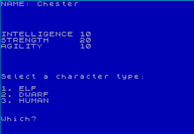 You start by assigning a pool of 40 points to three attributes: strength, intelligence, and dexterity, then choosing a race and class, which further modifies these statistics.