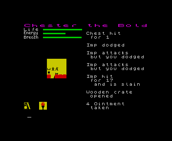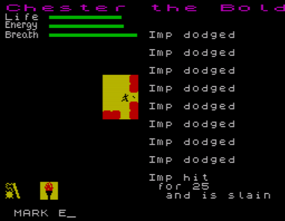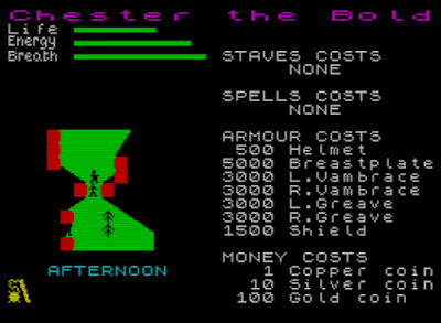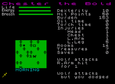 Again, I'd need to review my previous posts in detail to see if this is truly the first game to offer any of its elements, but either way, you don't usually find fog of war, day/night cycles, ability to mark territory, fleeing enemies, breakable equipment, random generation of territory, and dynamic adjustment of experience points in the same early-1980s cassette game. I expected contemporary reviews to be good, and at least one was: CRASH magazine gave a glowing review in its December 1984 issue, rating it 9/10, and praising most of these elements. Unfortunately, it also notes that it "will take months to complete." Even accounting for hyperbole, that probably translates to at least three or four times the investment I've already given it, and the game, while decent, isn't quite worth it. It earns a solid 21 in my GIMLET, hurt by no game world or NPCs, but bolstered by a good approach to equipment and economy.