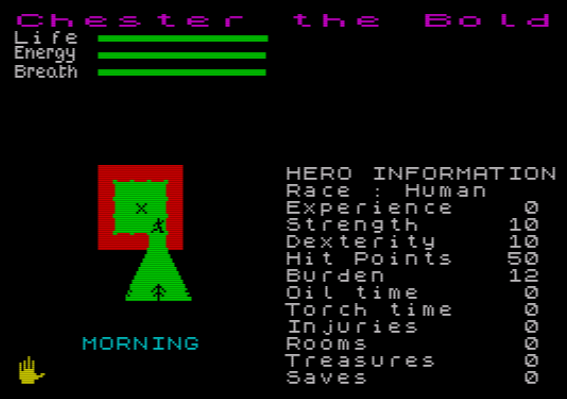During the creation process, you select from six quests or no quest at all. The quest names all use Tolkien terminology, but they boil down to the same thing: go and find an item somewhere in the dungeons and return it to your house. The game lets you give a name to the scenario so your friends can play the same one and you can compare your final times and number of saves. This was probably the last year that game developers were under the illusion that gamers actually played that way.