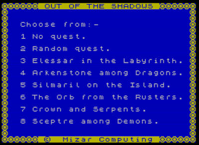 Out of the Shadows was developed by Mizar Computing of Milton Keynes, Buckinghamshire. I can't find any record of the company producing any other games. The World of Spectrum database lists the developers as Robert W. Waller and Richard M. R. Woodward, but I can't otherwise find any information on either of them. Their game may not have led me to play to the end, but it didn't deserve to be forgotten.