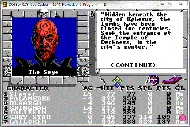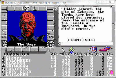 The game manual told me to seek out the Sage's hut and ask the Sage about the Tombs. The Sage required a bit of a bribe, but I managed to get a hint from him to visit the city of Ephesus. This led me to my first dungeon; I am currently mapping level 2 and still haven't had a decent stand-up fight.