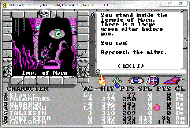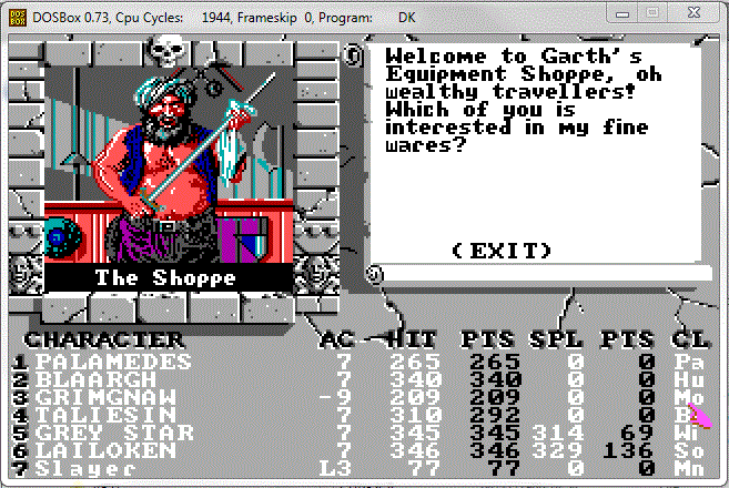 Okay, so I followed y'all's advice and kept my Bard's Tale I characters. To make it at least somewhat challenging, I ditched all their equipment. I changed my two spellcasters to the new "archmage" class, bought some basic swords and armor (the shop in every town is called "Garth's," just like in Skara Brae), and set out...