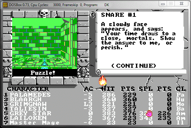I managed to find the first segment of the Destiny Wand. The "snare" part of the dungeon was somewhat interesting. I assume the other segments involve something similar. Basically, I had to interpret a series of clues written on the dungeon walls to get through the maze and find the segment. The moment I entered the "snare," a voice told me that I had a limited amount of time, but it couldn't have been that limited, because it took me a while to bumble through it. Spells didn't work, and the "time out" function was disabled. The puzzle consisted of: