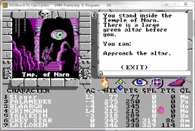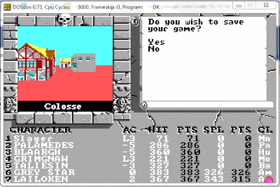 3) I discovered that there's a "save game" option completely independent of saving your characters, and that you can save anywhere--even in dungeons. Somehow I missed this in the manual. I had been trekking back to a guild every time I wanted to save, and then I was only saving my characters attributes, not what I had accomplished in the game. Bollocks.