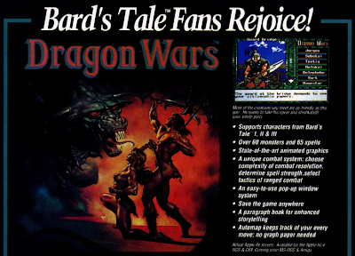 Matt Barton's interview with Rebecca Heineman suggests that the lack of a Bard's Tale name hurt the game, and sales were low. Perhaps this is what led Interplay to abandon this type of CRPG. With the end of Dragon Wars, we've really reached the end of a lineage. The game that was supposed to be The Bard's Tale IV feels enough like its predecessors to belong to the same family, but at this point, Brian Fargo becomes more a producer than a developer, and Rebecca Heineman moves on to programming action games (her only RPGs that I can find after Dragon Wars are conversions). One final game, Swords and Serpents, released solely for the NES, shows a certain Bard's Tale ancestry, but otherwise it's up to Might & Magic to carry the multi-character, first-person genre forward for a while.