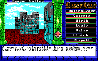 I have to say a word about the macros. I used them a little. In theory, it's a good idea: if the player wants to use a character's "bandage" skill a lot, rather than making him type U-6-S-A-B every time, just map those keystrokes to one of the function keys. The problem is that the macros don't save with the game, so you have to re-create them every time you reload. Even if you don't reload for a while, little changes in things like the character order or the number of skills available can "break" the macro. Still, few games of the era offer any options along these lines. Score: 6.