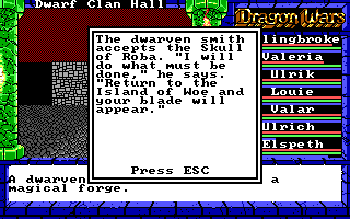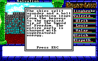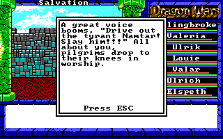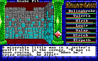 1. Game World. To me, the game world is unquestionably the best part of the game. Sure, we've seen "kill the evil wizard" in a lot of games before, but rarely has it been done with this much detail and attention to the plot. Namtar's history, the geography and history of the islands, the cities' uses of dragons, the gods, and other bits of lore are slowly and satisfyingly revealed through NPCs and journal entries. The party's own place in the game world is clear from the outset, and I love the beginning of the game, with the characters starting naked in a lawless city. Decisions you make effect permanent change on the world: witness my deciding the siege in favor of Byzanople, or the destruction of Phoebus. There will be later games with even more detail and intrigue, but this game, along with the Ultima series (which lacks a dynamic world) set the bar for other CRPGs in this era. Score: 8.