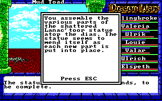 Part of the fun of finishing "journal" games is reading the entries you never found, trying to determine which of them are fake. In Wasteland, there was an entire plot about aliens embedded among the fake entries. Dragon Wars's fakes are mostly humorous ("Try as you might, you just can't get your nose to remain on your face. That Namtar sure has an odd sense of humor"), but there are a few meant to lead you down the wrong path. There was one that suggested an alternate solution to the flooding problem in the City of the Yellow Mud Toad that would have you searching around for a "magic plant." Another suggests that Lanac'toor can be revived. There are a few related to a nonexistent plot with a vampire lord. But for the most part, most of my unread entries looked like they could have been plausible, and I assume I just didn't get them during the course of gameplay.