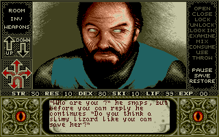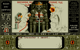 - 5 points for graphics, sound, and interface. I quite liked the graphics. The sound in the DOS version was sparse, mostly limited to combat attacks. I give it a little credit for the music even though I don't really care about game music. Mostly, I was surprised at how well I took to the interface. As you know, I'm normally not a fan of a mouse-only interface, but it worked surprisingly well here, even if there were times I wished I could just go forward and turn with the arrow keys.