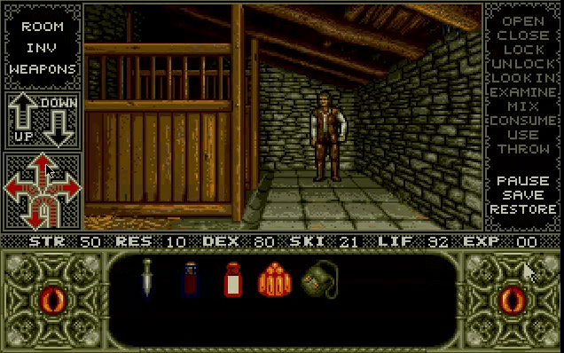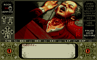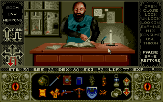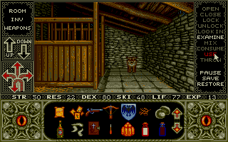 Elvira was developed by the U.K. company Adventure Soft under its Horror Soft label, and the interface for Elvira is a clear update of the label's first adventure game, Personal Nightmare (1989):