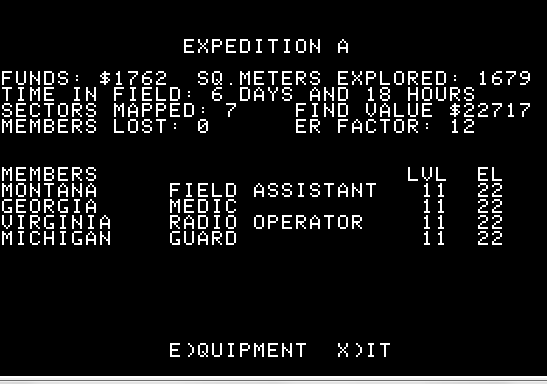 In his comments and e-mails, Willard Phillips indicated that he's a Korean War veteran with a mechanical engineering background, and he was already 50 years old when he started writing Expedition Amazon in 1981. He was a self-taught programmer ("using short compiled BASIC routines tied together with machine language"; some readers, unlike me, will understand), and he wrote the game primarily as a programming exercise. Later, he met the owner of Penguin Software, Mark Pelczarski, at a software show and convinced him to publish the game. (Jimmy Maher has an excellent article on Mr. Pelczarski and the company if you're interested, though he doesn't mention this game.)