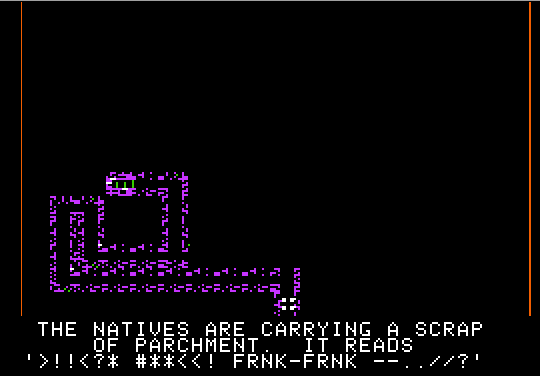 In all the crypts I had pried open on the upper levels, I never got the encounter I was supposed to get where I'd learn how to read Incan runes, at which point I'd start getting actual hints from all of the natives I was killing. I still don't know what I was missing there. But I'd already cracked the file in Notepad and read the hints, so I knew what they said. One of them was "FIVE OVER FOUR EVERY VERSE WILL WIN." I guessed this meant that I wanted to find the area with five ticks over four ticks. I didn't know what "EVERY VERSE" meant, but phonetically it sounded like "reverse," which turned out to be the trick.
